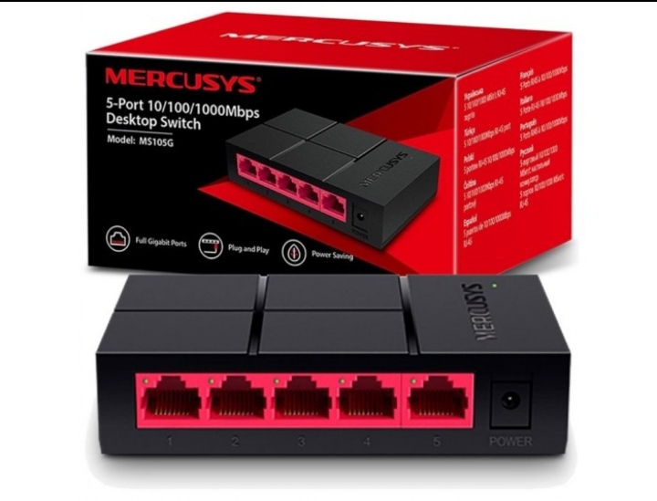 Mercusys MS105G 5-Port 10/100/1000Mbps Desktop Switch Hub Five 10/100/1,000 Mbps auto-negotiation RJ45 ports with auto MDI / MDIX supported Easily wired network expansion Compact design for flexible arrangement Plug and play setup, no configuration required Green Ethernet technology saves power by up to 82% Package Contents • 5-Port 10/100/1000Mbps Desktop Switch (MS105G) • Power Adapter • Quick Installation Guide