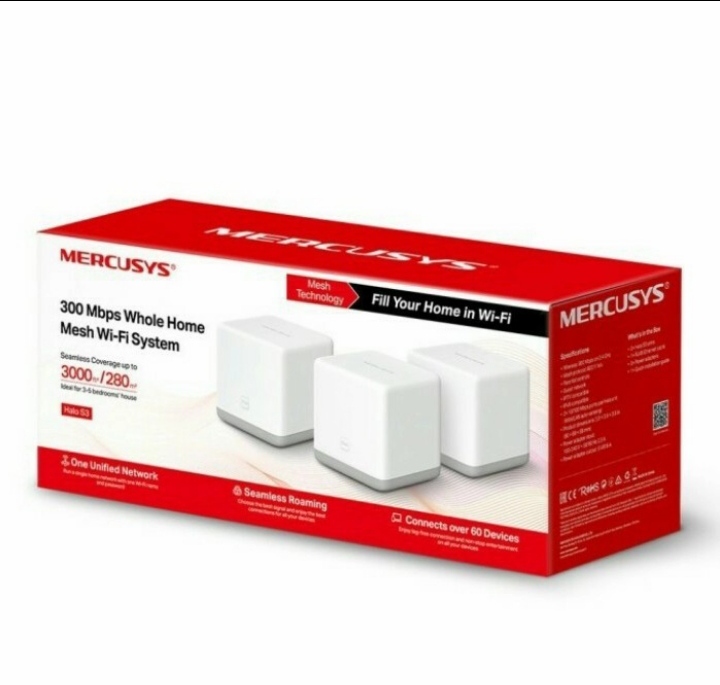 Mercusys Halo S3 300Mbps Whole Home Mesh Wi-Fi System 3Pack *Mercusys Halo S3 (Isi 3)* _300Mbps Mesh Wi-Fi System_ *Highlight fitur:* -> Dengan Mesh Technology, setiap unit Halo S3 dapat terhubung ke 1 jaringan Wi-Fi dengan nama sama dan password yang sama, solusi untuk mempermudah jaringan Wi-Fi di rumah anda -> Fitur seamless roaming yang secara otomatis menghubungkan perangkat antar Halo saat anda berkeliling di rumah anda, dan dapatkan sinyal terbaik untuk seluruh perangkat anda -> Halo S3 isi 3 dapat menjangkau sampai dengan 280meter persegi, Halo S3 isi 2 dapat menjangkau sampai dengan 200meter persegi -> Halo S3 dapat…