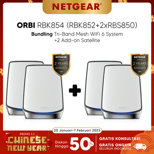 SPECIAL OFFER BULAN JANUARI KHUSUS PELANGGAN DI AREA DKI. JAKARTA!!! Untuk pembelian Orbi RBK854, Anda akan mendapatkan: ✅ GRATIS SURVEI ✅ GRATIS ASSESTMENT ✅ GRATIS INSTALASI / PEMASANGAN ✅ GRATIS BIAYA TRANSPORT TIM ENGINEER KAMI KE TEMPAT ANDA RBK854 – BUNDLING: RBK852 + RBS850 WIFI 6 MESH (TOTAL: 1 ROUTER 3 SATELIT) 1 paket terdiri dari: (1) Router Orbi RBK852 + (3) unit Orbi RBS850 Merupakan special bundling dari kami. Perpaduan sempurna untuk Anda yang ingin memiliki rumah yang luas dan menginginkan WiFi yang kuat dan stabil di seluruh penjuru rumah Anda. RBK852 : https://www.tokopedia.com/netgear/netgear-rbk852-orbi-tri-band-wifi-mesh-system-ax6000-1router-1satelite RBS850 : https://www.tokopedia.com/netgear/netgear-rbs850-orbi-tri-band-wifi-mesh-system-ax6000-satelite Garansi Resmi…